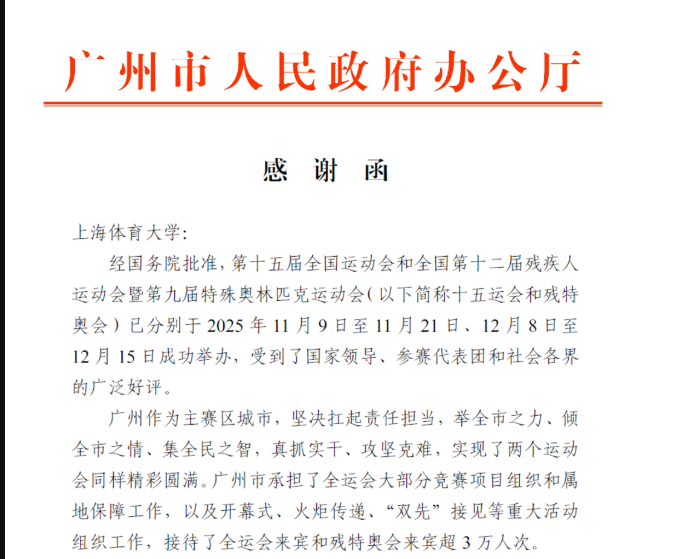 广州市政府致函我校感谢为十五运会和残特奥会提供的“首席专家”专业技术服务